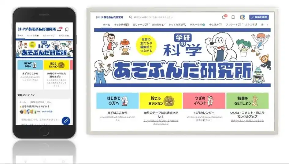 | 「あそぶんだ研究所」は実験キットつき書籍「学研の科学」の読者をメインに、全国の科学好きな子どもたちが集まるオンラインコミュニティです。自分たちの好きなものを投稿して全国の友だちからコメントをもらったり、オンラインワークショップに参加して、おうちで科学実験を楽しんだり、学研の科学編集部が直接子どもたちとふれあいながら、科学の楽しさを共有しています。 | ||||||||||||||||