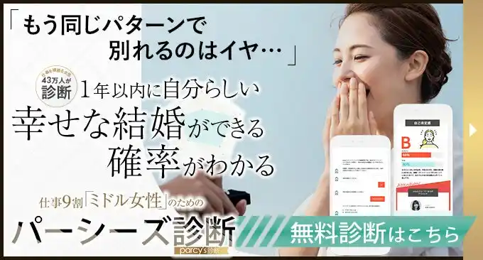 パーシーズ診断は、結婚したいけど婚活が長期化している、同じパターンで別れを付き合っても結婚まで進まない理由を「超精密」に診断することができる、恋愛・結婚のパーソナルトレーニング「parcy's」(パーシーズ)のオリジナル診断テストです。企業で用いられる適性検査レベルの高精度分析アルゴリズムによってあなたの結婚を掴む力を「超精密」に診断することができます。 |
