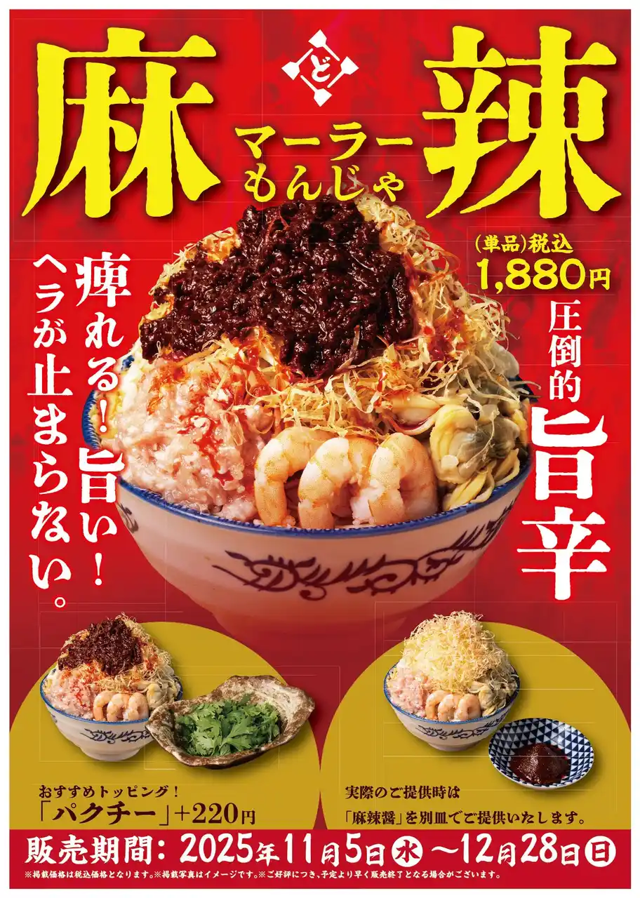 今年のトレンドである“麻辣ブーム”の中、辛さ×旨さ×香ばしさを追求して開発した人気メニュー。 花椒(ホアジャオ)のしびれる刺激と唐辛子の辛味、そして鉄板で焼き上げることで生まれる香ばしい旨味が融合し、“究極のシビ辛もんじゃ”に仕上がりました。 |