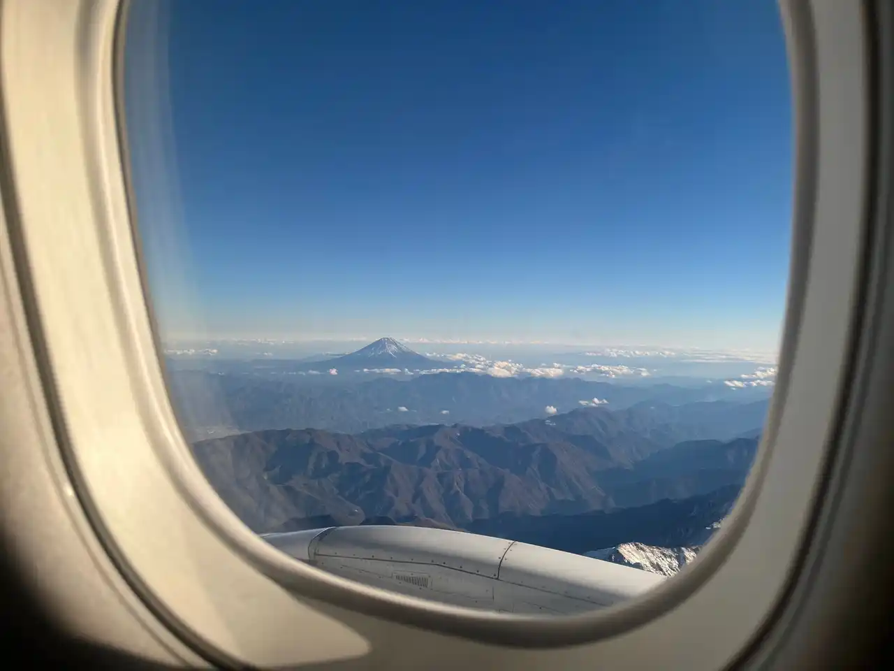 次に向かうは琵琶湖、アルプス山脈の上空を通って富士山へ。普段、初日の出フライトで必ず行くというお墨つきの絶景ポイントも通り、雪化粧の山々に囲まれた雲一つかかっていない富士山が見られ、あまりの美しさに皆が息をのんだ。 |