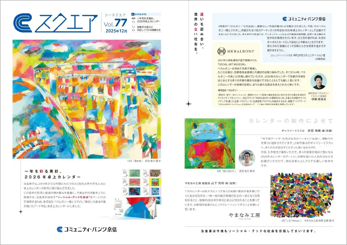 ヘラルボニーが初めて京都で開催したこの企画が、京都信用金庫様との最初のお取り組みでした。そこから4年、ヘラルボニーの思いに共鳴し続けていただき、2026年のカレンダーで京都の作家をはじめとする多くの作家の異彩をお届けできることをとても嬉しく思います。 |