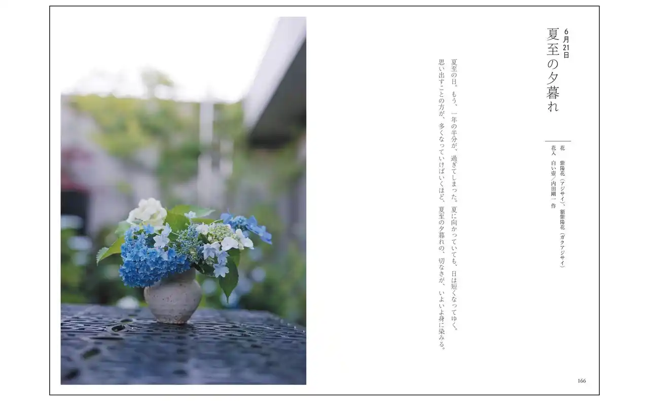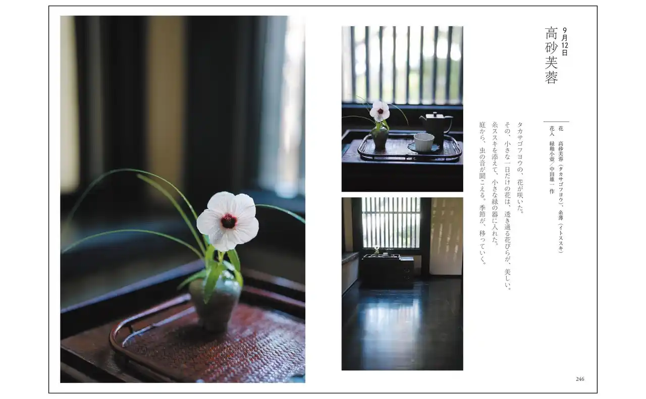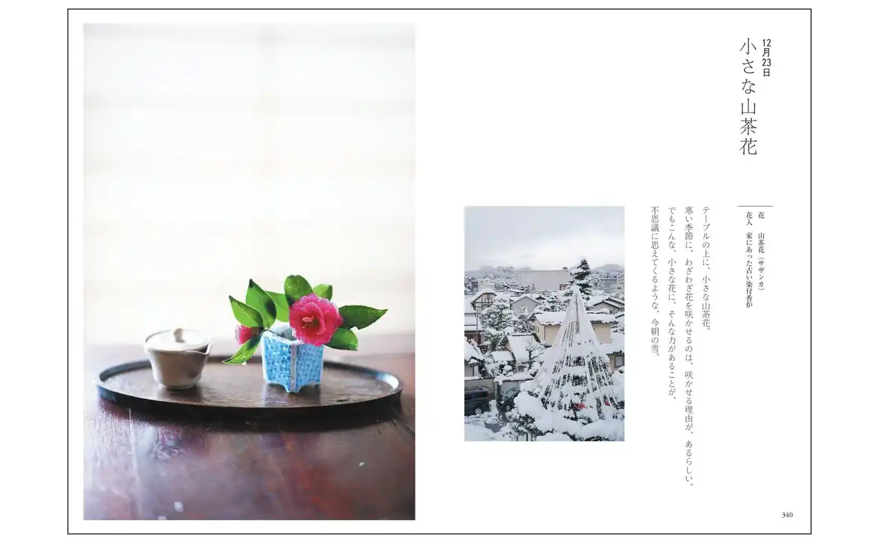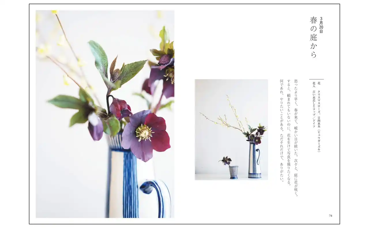 | 1年12か月、ほぼ2日に1度撮り続けた写真からは、あるがままの花の魅力が伝わってきます。その花への思いと、日々の営みを重ねて綴られた言葉は、暮らしの歳時記としても楽しめます。また、花材、器、場所と、花作品のバリエーションも多様で、自分で花を生ける際のアイデア集としても使えます。 | |||||||||||||