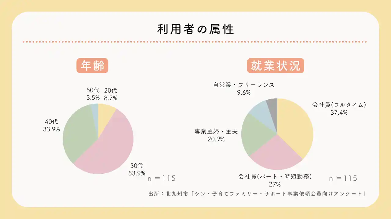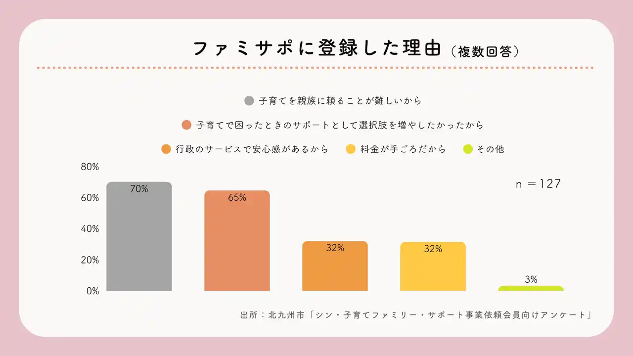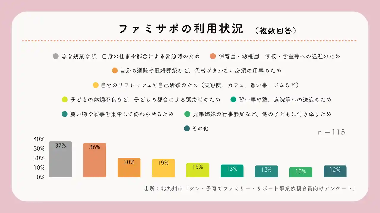 北九州市が推進する「シン・子育てファミリー・サポート事業」(以下、ファミサポ)の利用者アンケートで、そんな“生の声”が寄せられました。 |