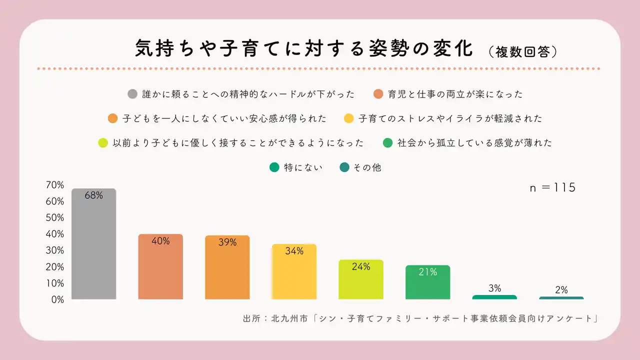 また、利用者の67.8%が「誰かに頼ることへの精神的なハードルが下がった」 と回答。これは「一人、もしくは夫婦だけで頑張らなくてもいい」という、心理的な重圧からの解放を表しています。 |