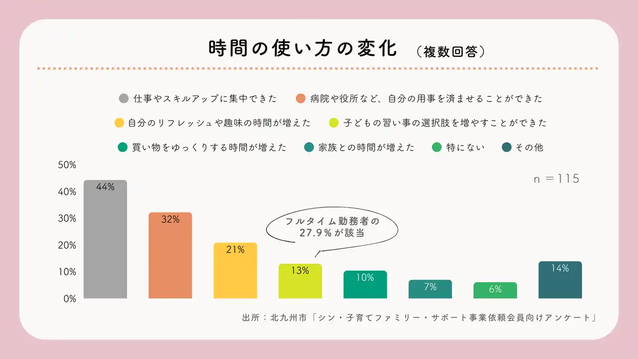 この結果は、働く親の約半数が時間の使い方の変化として挙げた「仕事やスキルアップに集中できた」(44.3%)という回答にも表れています。 |