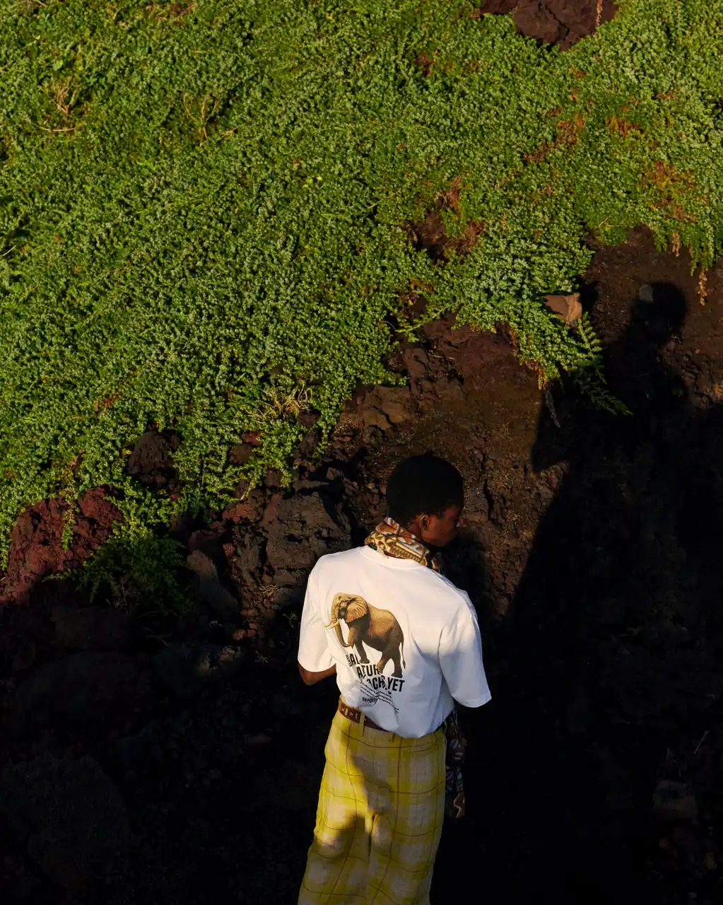 ケニアに生息するゾウ、シマウマ、ライオンのグラフィックを背中に大きくプリントした半袖Tシャツ。14番手の糸で織り上げたUSAコットン天竺を使用し、シャリ感のあるドライタッチと程よい肉感で、季節を問わず快適に着用できます。肩幅と身幅にゆとりを持たせ、ネックは身体に沿う設計でメリハリのあるシルエットに調整。裾のオリジナルピスネームがさりげないアクセントになっています。 |