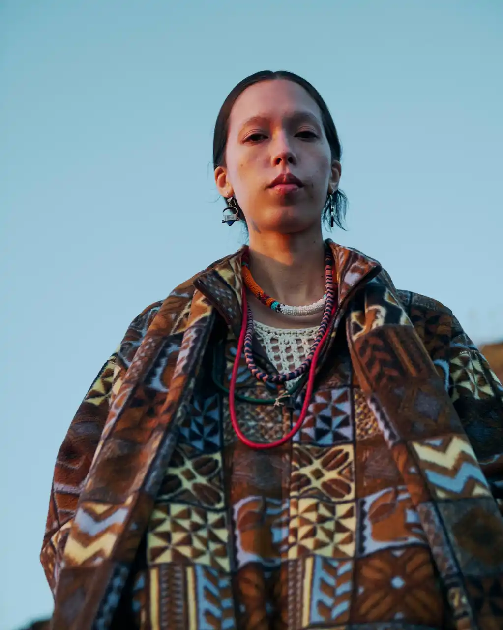 ブルゾンやバラクラバと同じオリジナルパターンを使用したフリースマフラー。程よい肉感の厚手ポリエステルフリース素材で、保温性と存在感を両立しています。カジュアルにもエスニックにも合わせやすく、男女兼用でスタイリングのアクセントとして活躍。無地のコートやニットに合わせると、立体的な総柄が際立ち上品な印象に。大判のオリジナルパッチが高級感を添えています。 |