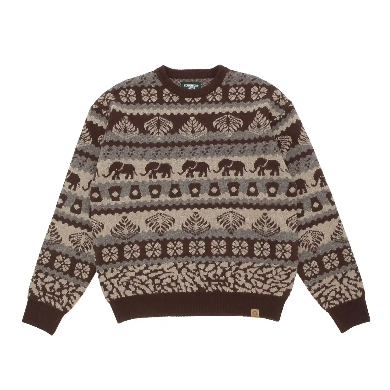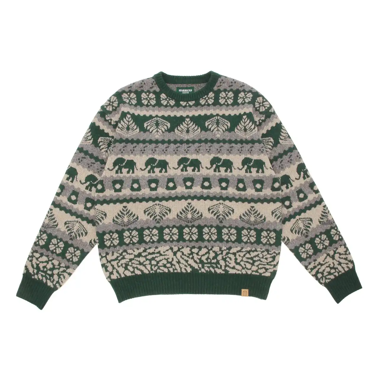 アフリカゾウやラテアート、スターバックスのカップやコーヒー豆を遊び心たっぷりに描いたオリジナルパターンを制作し、ジャカード編みで柄を際立たせた5ゲージのウール100%ニット。 |