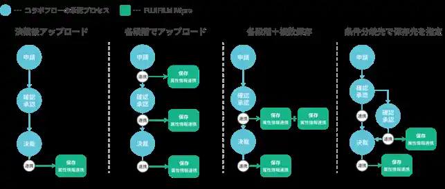 コラボフローからFUJIFILM IWproのドキュメントにアップロードする際に、コラボフローの申請データをアップロードするドキュメントの属性情報として連携する。 |
