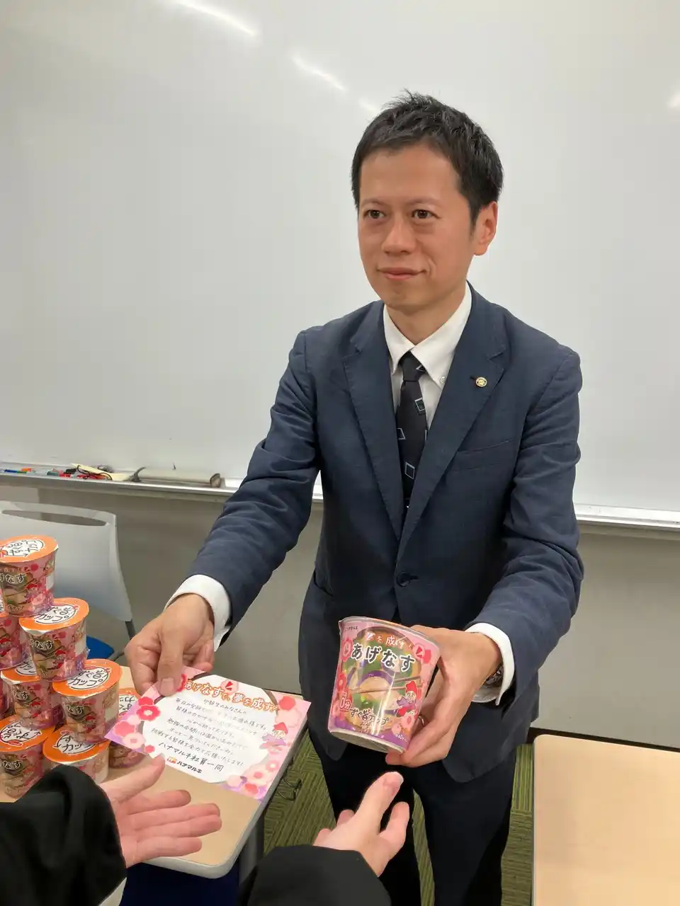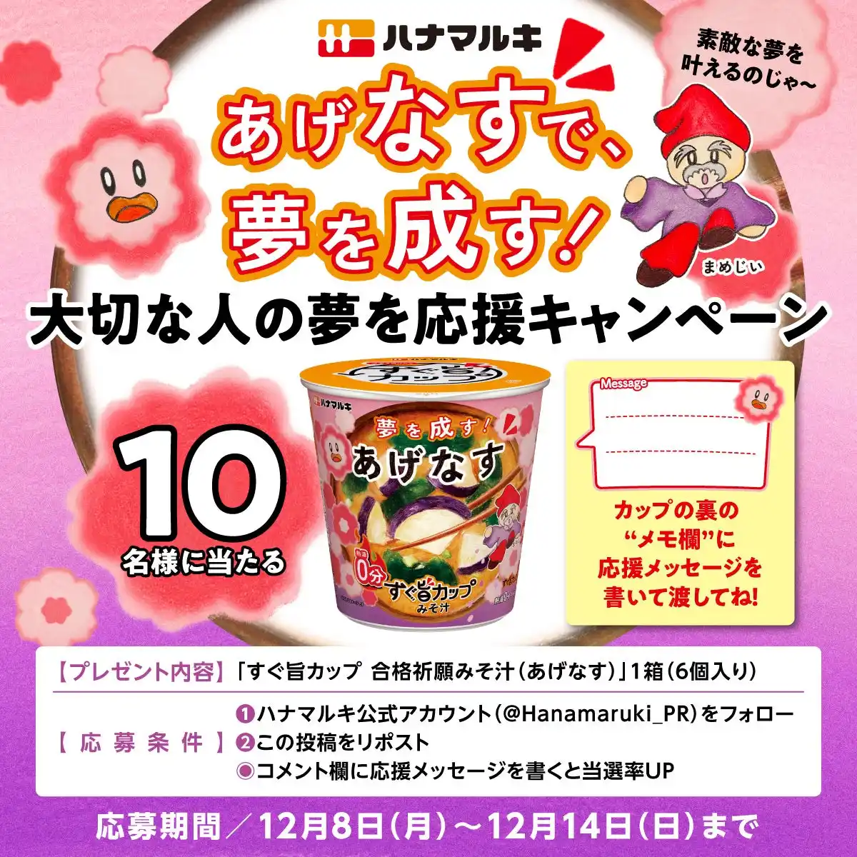 味噌・醸造製品メーカーのハナマルキ株式会社(本社:長野県伊那市、代表取締役社長:花岡周一郎、以下当社)は、当社の即席みそ汁ブランド「すぐ旨カップみそ汁」シリーズより、人気No.1フレーバー「あげなす」を、受験生応援の期間限定デザイン「すぐ旨カップ 合格祈願みそ汁」として、2025年11 月下旬より出荷開始しました。また、総合進学塾の臨海セミナー グループ(本社:神奈川県横浜市、代表取締役社長: 佐藤博紀、生徒数 73,074名 ※2025年9月現在にて、今回は大学受験科の高3生を対象に本商品のサンプリングを実施いたしました。 |
