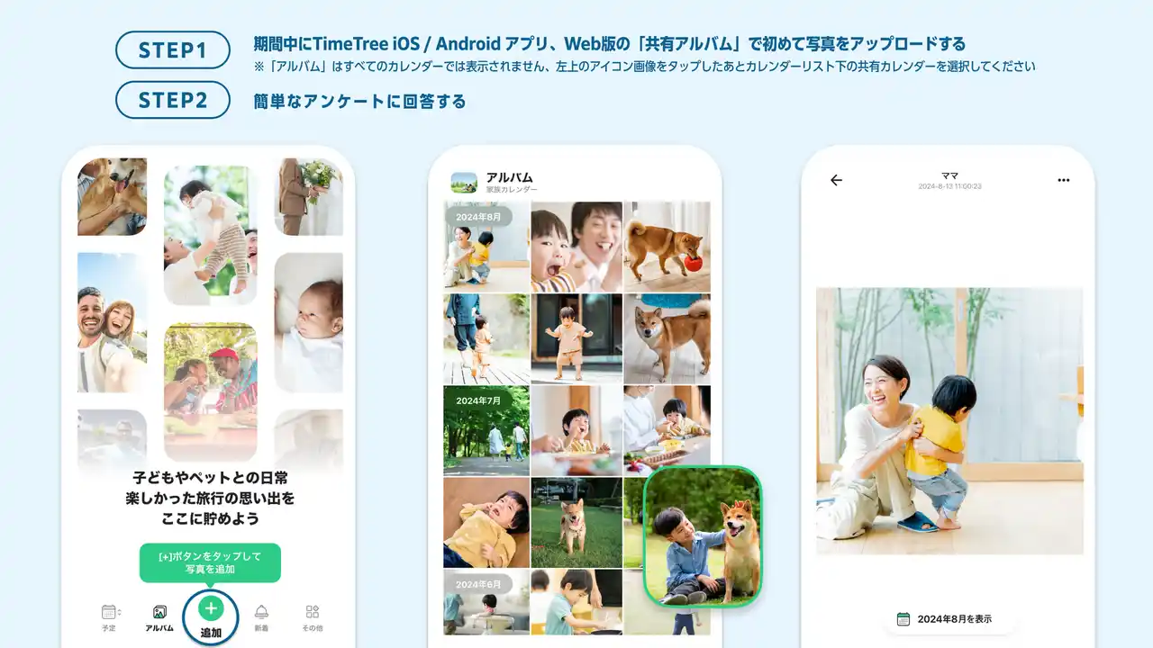 STEP1. 期間中にTimeTree iOS / Android アプリ、Web版、いずれかの「共有アルバム」で初めて写真をアップロードする |