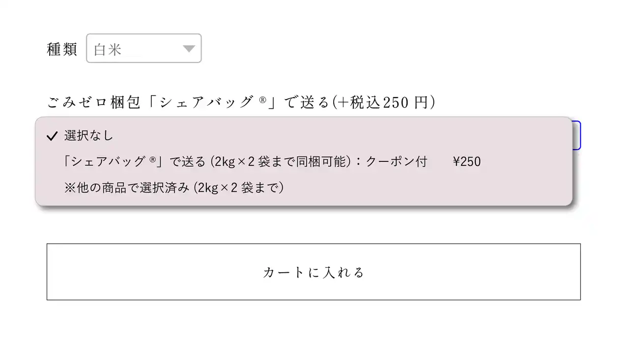 通常商品では、Natural Farming の商品ページから「ごみゼロ梱包シェアバッグで送る」を選択し、商品をカートに追加すると、その商品がシェアバッグで届きます。シェアバッグをご利用の場合、お米2kg×2袋まで一度に配送できます。 |