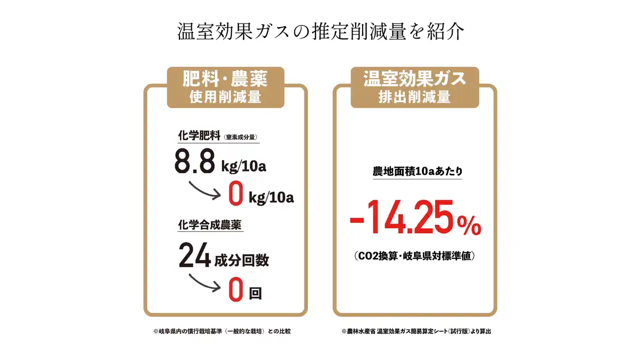 さらに、自然栽培や有機栽培で生産されたお米が、どのくらい温室効果ガス削減に貢献できるのかを「みえる化」する取り組みも進めています。農林水産省の「みえるらべる」を採用し、一般的な栽培方法との比較を示しながら、商品ごとに環境負荷の削減量をわかりやすく紹介しています。 |
