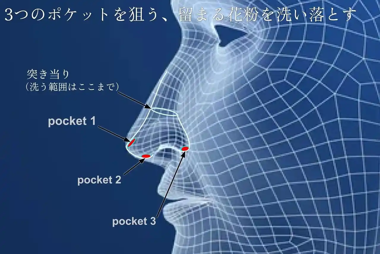 【命の入り口を磨く】 苦しいことはありません。洗う範囲は(上皮と分類される領域)異物が集中する入り口だけです。鼻毛や狭く歪な空間が80%の異物をこしとると言われています。その鼻のなかには窪み(pocket)が在り、そこに鼻水によって押し流された異物が集積すると考えられます。反応の強い部位を特定し、洗浄することにより、花粉対策は革命的にかわります。自身のからだが拒絶した、花粉などの異物を外に押し出す仕組みをやさしくアシストします。 |