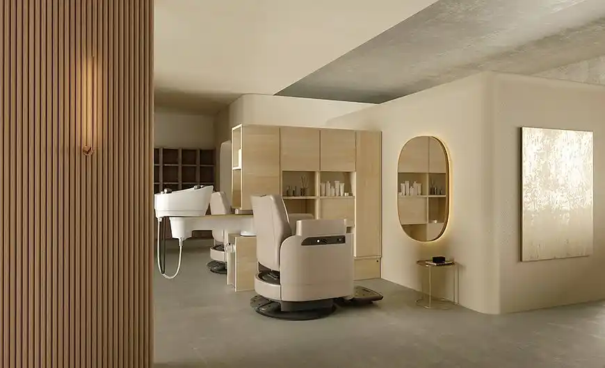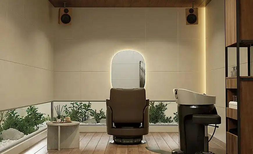 近年、理美容室では個室・半個室の導入が進み、多機能チェアと定点サービス用シャンプー機器の組み合わせにより、お客さまが移動することなく様々な施術を受けられる“定点サービス”が急速に浸透しています。こうした背景のもと、サロンの付加価値を高めるうえで、空間の質やお客さまが過ごす時間の心地よさへのニーズは一段と高まっています。 |