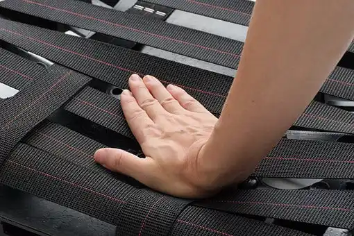 ウェビングをシートの土台に組み込み、身体を面でやさしく支える構造を採用。 |
