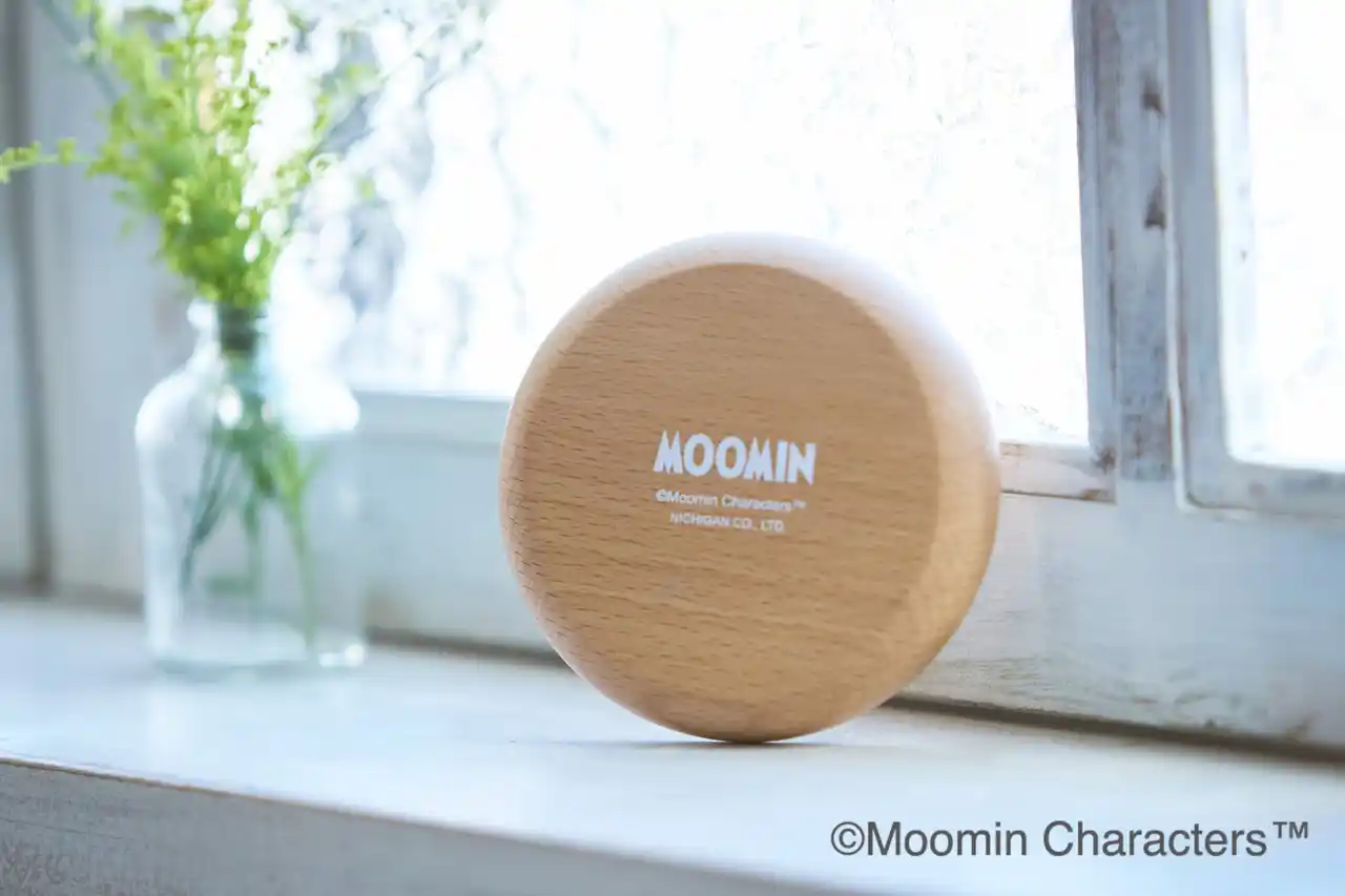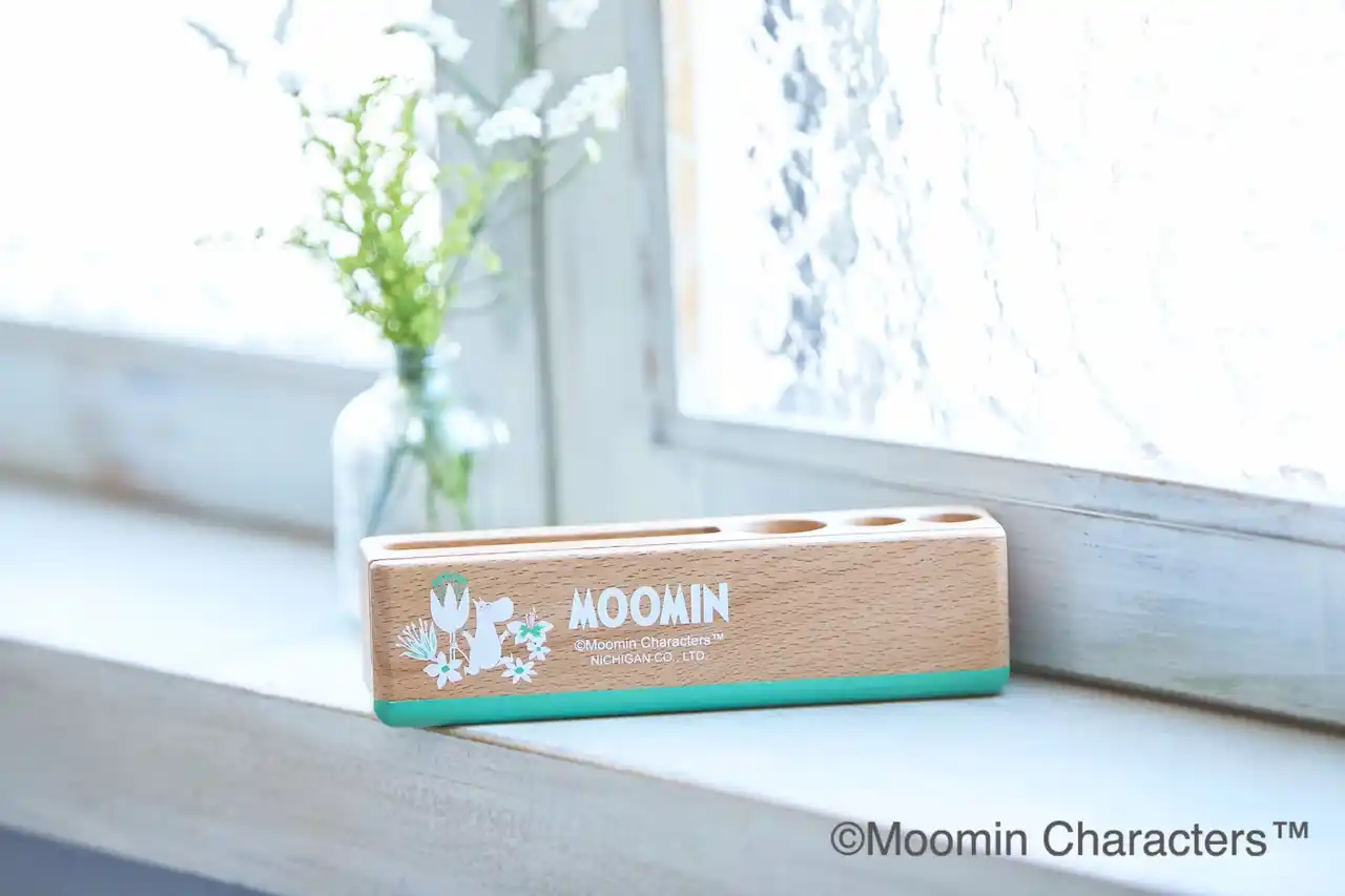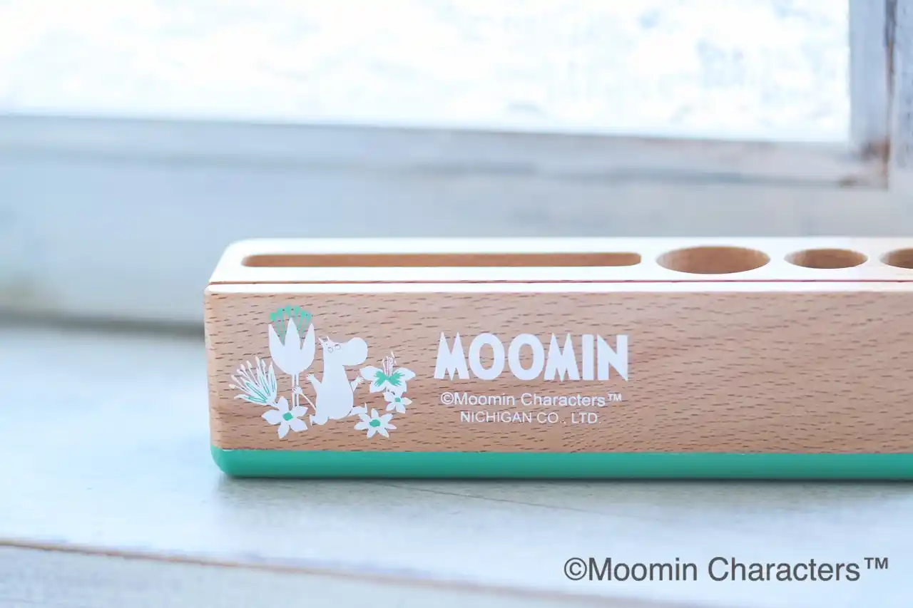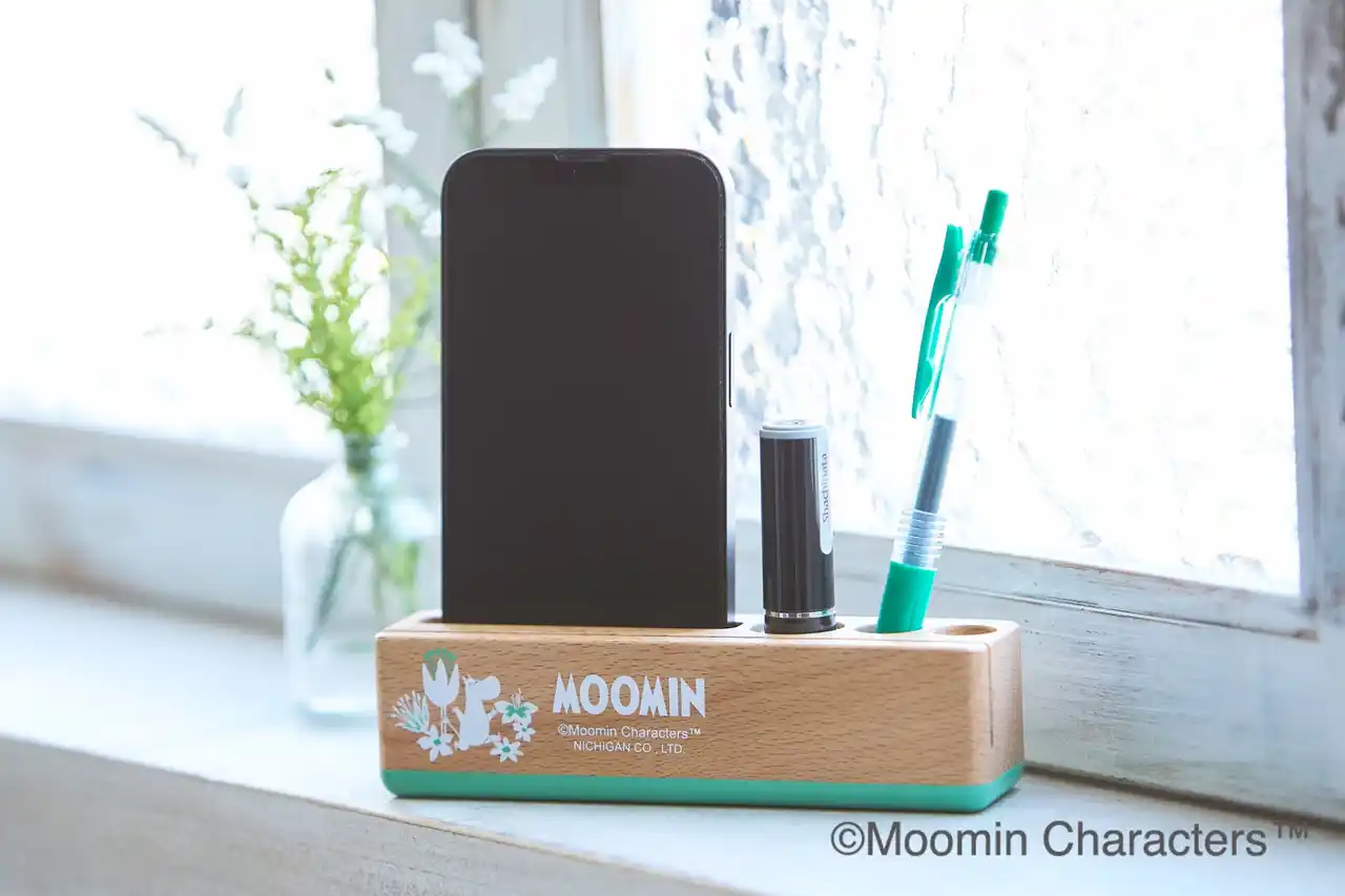 木のぬくもりにマッチしたムーミンのイラストが描かれたかわいらしいデスクスタンド。スマホ、印鑑、ペンが入ります。手前の溝にメモを入れることが出来ます。 |