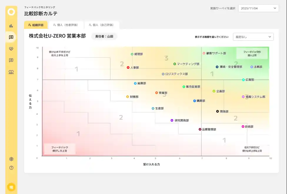 部署や部門ごとのフィードバック状況や受け入れ度合いをグラフで表示。組織全体のフィードバック文化を俯瞰し、偏りや不足を早期に発見。経営層や人事部門が戦略的に改善施策を打つための指標として活用できます。 |