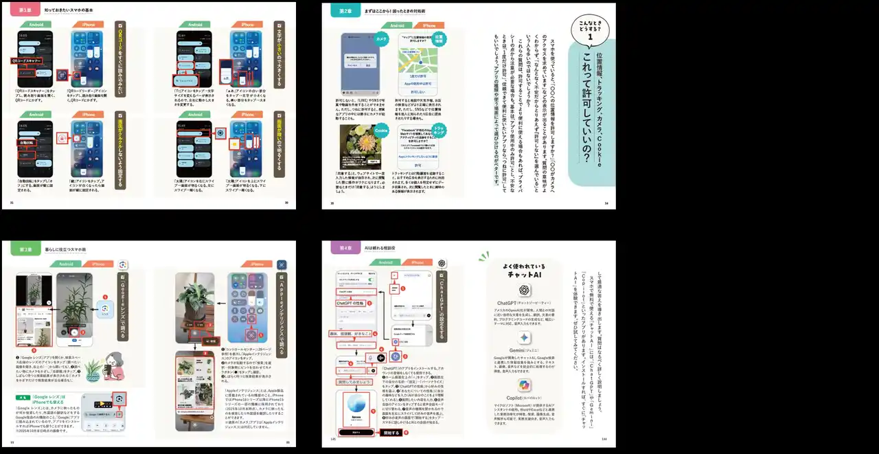 「わからないことを人に聞くのが億劫」「自分のペースで覚えたい」という多くのシニア層が持つニーズに応え、画面の文字を大きくする、QRコードを読み込むといったスマホの基本的な「困った」を即座に解決する対処術から、人生後半の暮らしをもっと楽しむため、LINEやカレンダー、Googleマップなどのアプリの便利な使い方も多数掲載。さらには、シニア層の日々の暮らしをハッピーにしてくれる相棒として、気後れせずに活用したいAIについても解説。その代表格であるChatGPTやCopilotで、旅の計画の立ててもらったり、メール文面などのメッセージを考えてもらったり、日常生活に役立つ具体的なシーンを紹介しています。