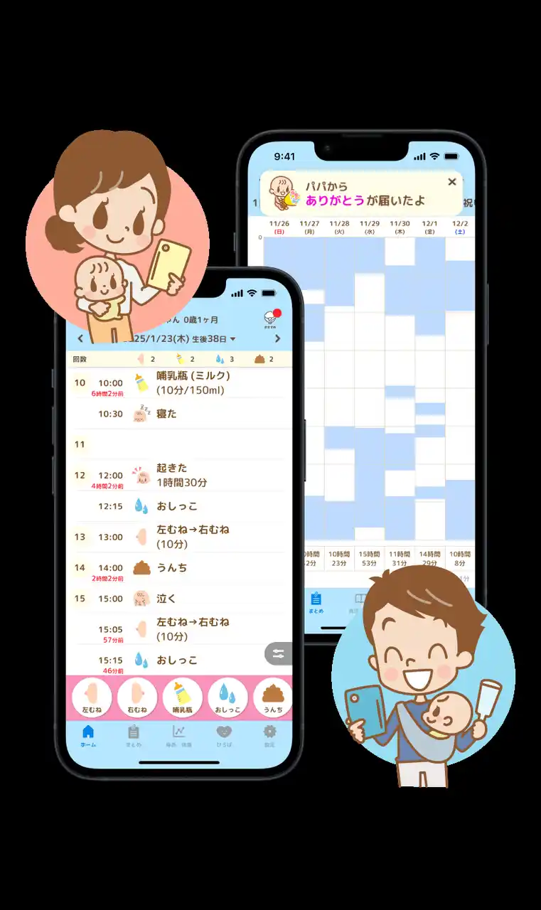 本アプリは、授乳時間やミルクの量、おむつ替え、睡眠時間など、赤ちゃんのお世話を簡単に記録できるアプリです。2012年のリリース以来、多くの家族に利用されており、累計ダウンロード数は180万(2024年5月時点)を超えています。 |