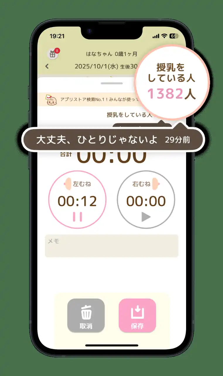 授乳またはミルクの記録時に、他のユーザーのつぶやきを閲覧・ 自身のつぶやきを投稿できる機能です。「いま、頑張っている仲 間がいる」という実感から、アプリを通じた新たな支え合いをつ くります。 |