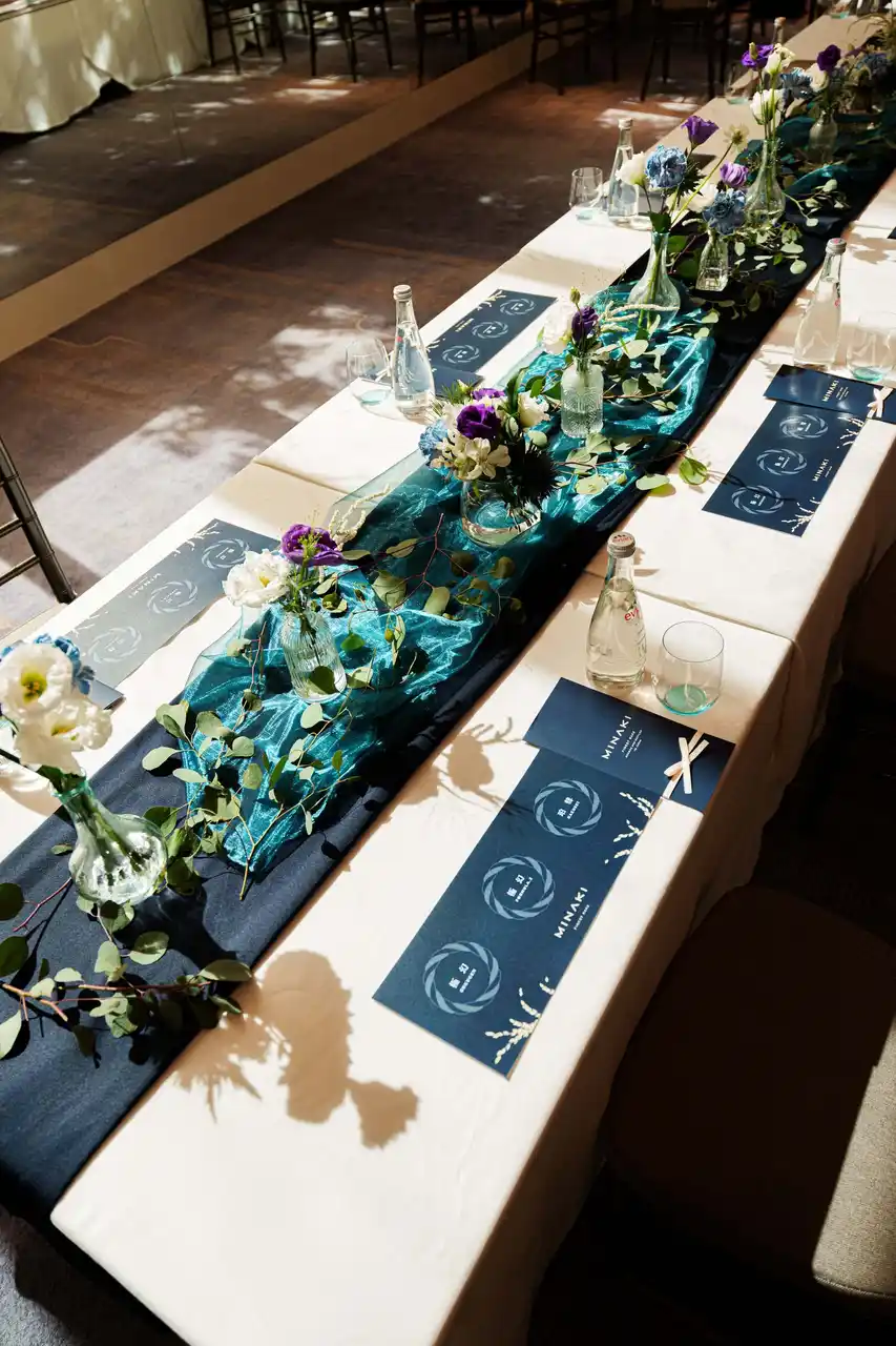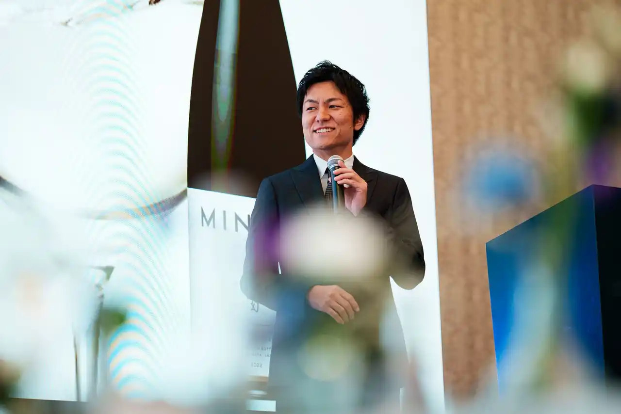 昼の部のメディア向けイベントでは、MINAKIが掲げる「体験設計」の哲学を軸に、日本酒の香りや味わいはもちろん、所作や空間演出も含めた“体験としての日本酒”を紹介。参加者は3種の銘柄を通じて、MINAKIが表現する世界観を五感で体験しました。皆木のプレゼンテーションでは、IWC(International Wine Challenge)など世界6つの品評会での受賞歴や、国内外300店舗以上での採用実績に触れ、MINAKIが築いてきた信頼と表現力が語られました。 |