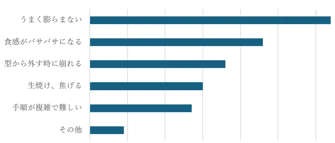 「うまく膨らまない」「食感がパサパサになる」(多数) 40代女性) 「生焼けや焦げが怖い」(30代女性) |