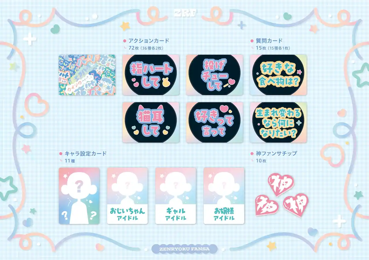 一番ファンサがよかったプレイヤーに渡される“神ファンサチップ”は得点が3倍!スピードだけではなく“神ファンサ”ができたかどうかが、勝負の命運を分けます。 エクストラルールとして、“王子様アイドル”や“お嬢様アイドル”、“オカンアイドル”になりきれる14種類のキャラ設定カードも用意。キャラ立ちしたアイドルにもチャレンジ! |
