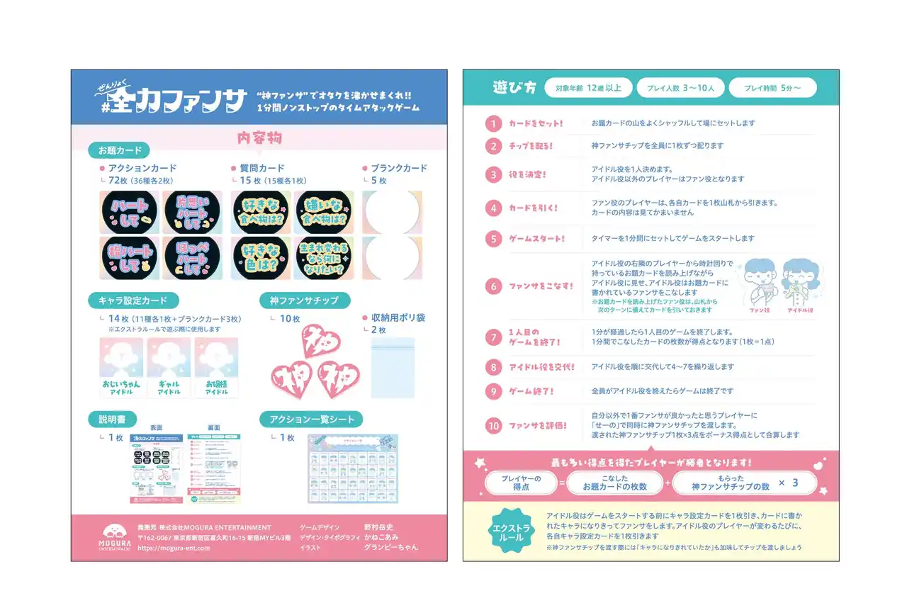 | 株式会社MOGURA ENTERTAINMENT(本社:東京都新宿区、代表取締役CEO:野村岳史)は、 “ファンサ”をテーマにした新作ボードゲーム「#全力ファンサ」を本日2025年12月8日に発売いたしました。 | |||||||||||||||||||