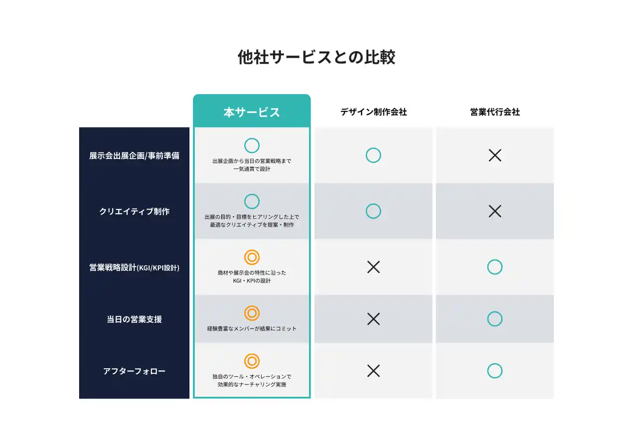 ・展示会現場での声かけ、商談化トーク、デモ誘導など営業実行代行 |