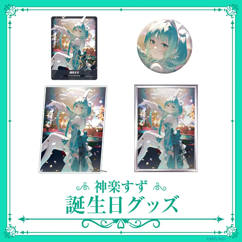 2025年12月15日(月)に誕生日を迎える神楽すずの誕生日記念グッズ&ボイスを、当社が運営する公式グッズ販売サイト(APPLAND OFFICIAL SHOP)にて販売いたします!記念ボイスにはVRバージョンが用意されており、BOOTHで購入可能です。ここでしかゲットできない誕生日限定グッズ&ボイスをお楽しみください! |