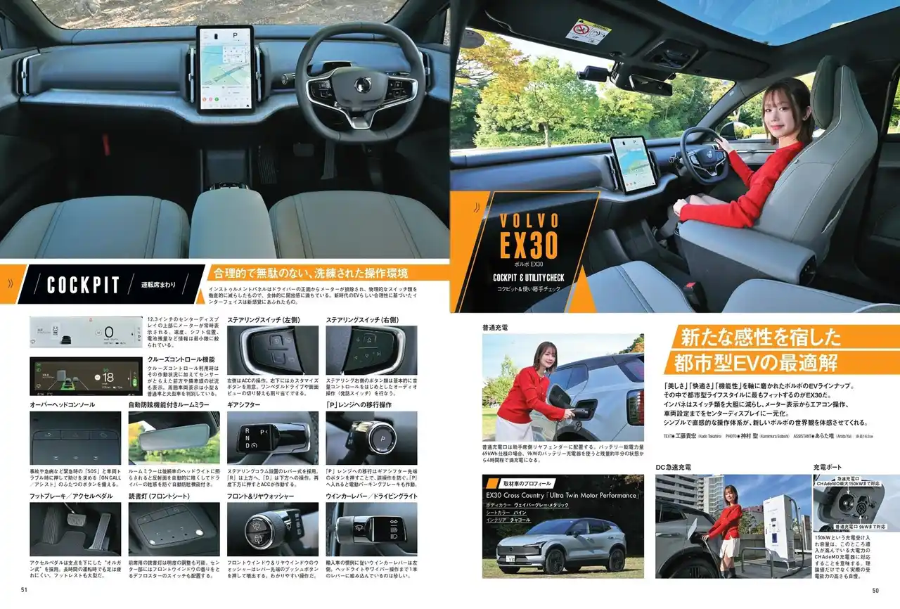 | ボルボが送るコンパクトBEV、EX30。Bセグメントに属する手頃なサイズは取り回ししやすく、機械式立体駐車場にも対応するなど、日本の環境にもピッタリ。インテリアはシンプルで心を安らげるスカンジナビアデザインを取り入れ、物理スイッチがほとんどないという先進性も魅力です。ハード面では最長で560kmの航続距離、ツインモーター仕様は156PS+272PSというパワフルさ、400万円台からという価格設定など、ユーザーの心をつかみます。次のクルマの有力な選択肢として注目される、ボルボEX30シリーズのすべてを紹介していきます。 | ||||||||