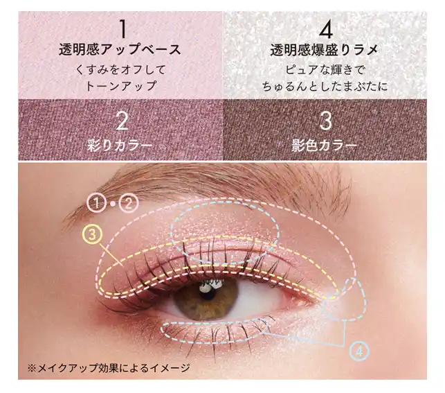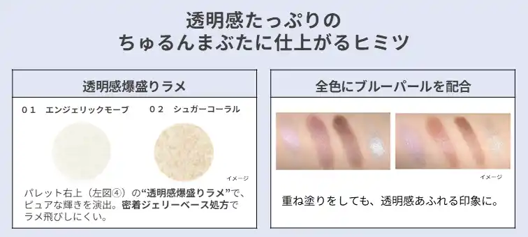 “透明感爆盛りラメ”を含む4つの質感に加え、全色にブルーパールを配合した特別仕様で、重ねるだけで“ちゅるん”とした透明感あふれる大きな目もとを演出します。 |