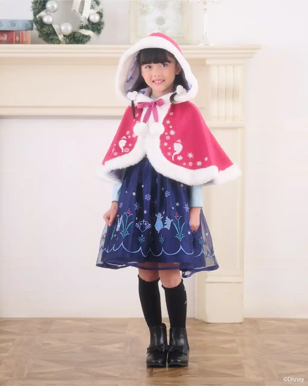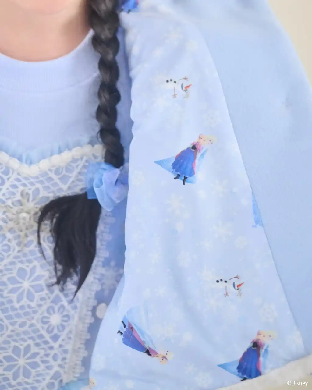 憧れの「エルサ」「アナ」をイメージしたポンチョは、雪のモチーフやキャラクターのシルエットを刺しゅうで表現し、メゾピアノらしく上品に仕上げました。 |