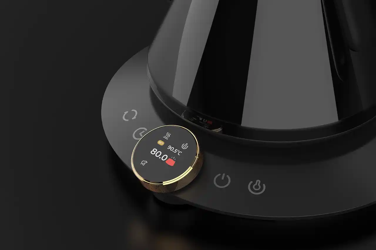 既存の“LUX600 Dali White”と同様に3重のミラーポリッシュ、UV保護クリア塗装、下地塗装、トップコートと高級車のような処理を施すことで独特の深みと艶感のあるブラックに。スーラージュ氏の作品の如く、黒の奥に潜む“光”の存在を表現できるようなブラックを目指して幾度となく調整を重ねました。本カラーもケトル本体からブランドロゴを廃し、ミニマルなデザインを追求しております。 |