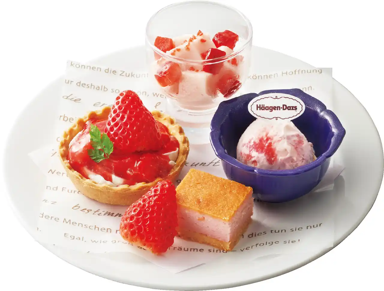 パイタルト、パンナコッタ、ハーゲンダッツいちごアイスといちごチーズケーキを一度に楽しめるアソート。色々な食感と甘みが少しずつ味わえるひと皿です。 |