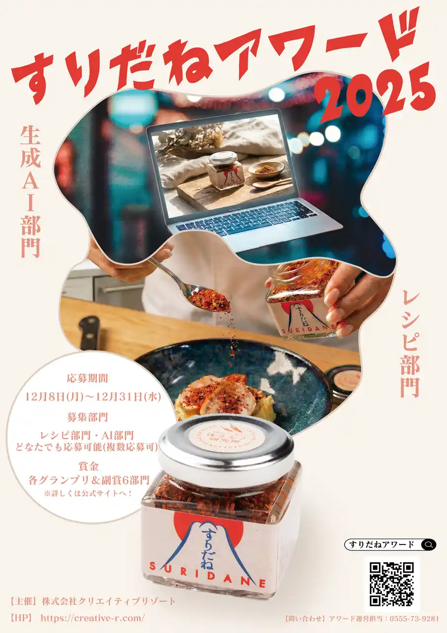 | 株式会社クリエイティブリゾート(本社:山梨県富士吉田市松山1603、代表取締役:加藤慎一)は、地域発の旨辛伝統調味料「すりだね」の魅力と可能性をさらに広げるべく、「すりだねアワード2025」を開催いたします。 | |||