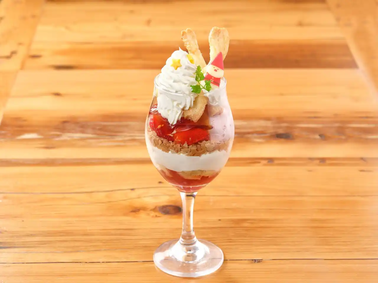 主役はみずみずしい“いちご”。ひと口食べると、紅茶のジュレのすっきりした香りと、シナモンやナツメグ香る洋梨のコンポートがふわりと広がり、甘さの中に上品な余韻が残る大人の味わいに仕上げました。フィアンティーヌのサクサク食感や、添えたパイをディップして楽しむ遊び心など、層ごとに表情が変わる“ときめき”が詰まった一杯です。見た目のボリュームに反して、食後感は驚くほど軽やか。お食事の後でもぺろりと召し上がれるのが嬉しいポイント。単品はもちろん、カフェと一緒に楽しめるドリンクセットもご用意しています。 |