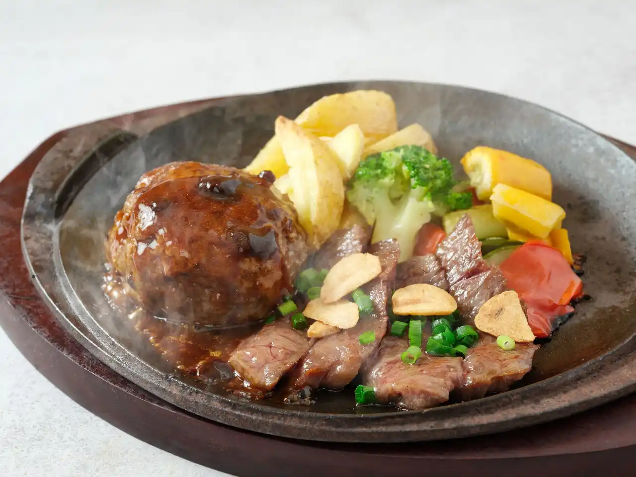 肉好きの心を満たす贅沢コンビ。人気の黒毛和牛ミニハンバーグをミニサイズで楽しめるうえ、旨みがギュッと詰まったハラミのカットステーキも添えた、既存店でもファンの多い人気メニューです。ソースは定番のデミグラスをはじめ、数種類からチョイス可能。 |