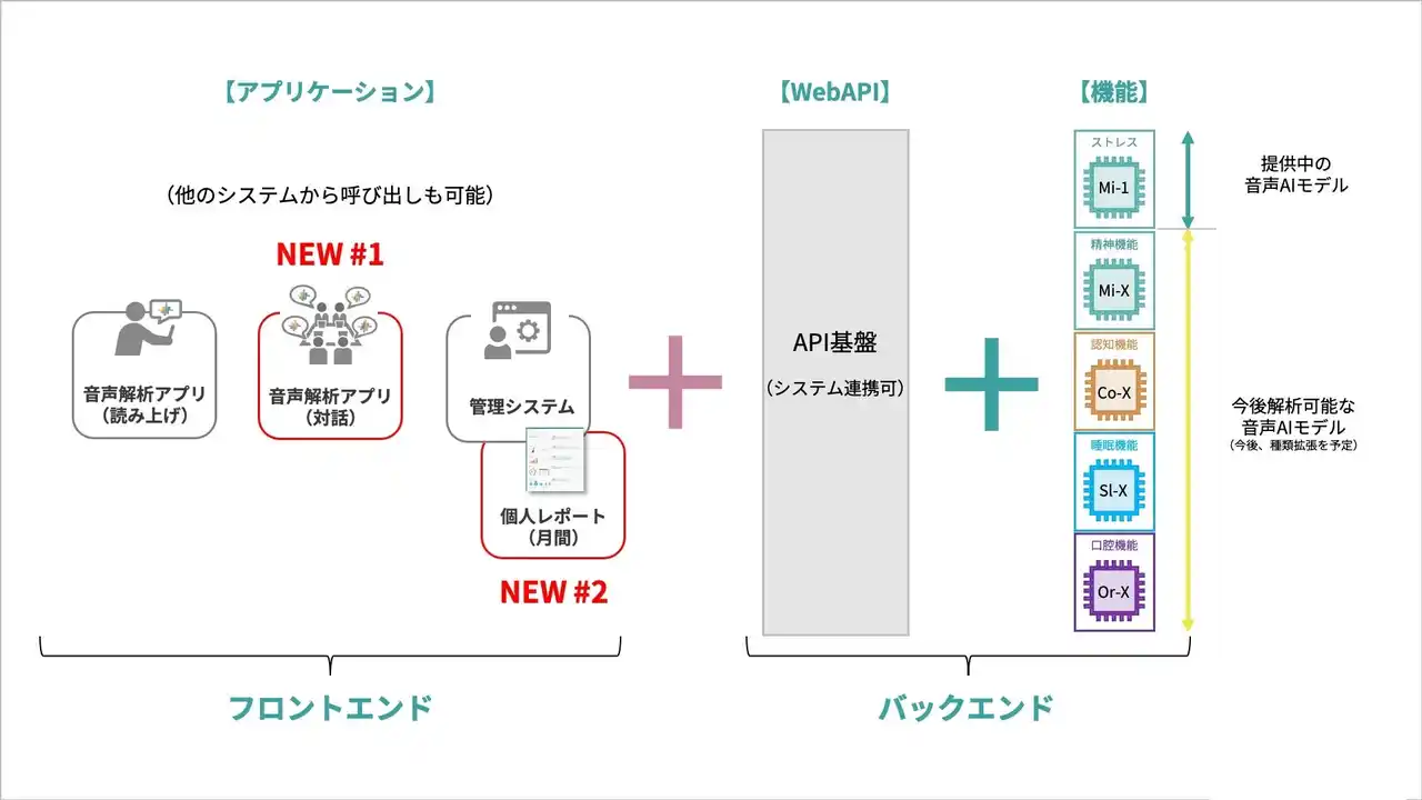 スマートフォンアプリやリモート会議ツール、PCアプリなどと連携し、「話すだけ」で気づかないうちに自分のコンディションを記録・確認できることが特長です。 |