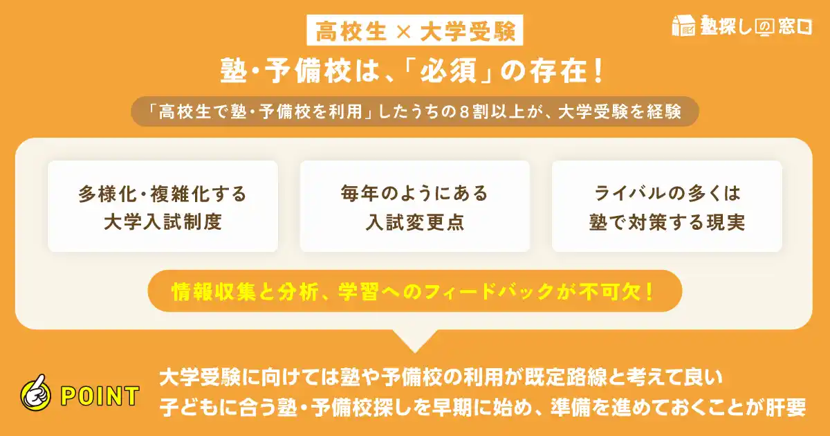 これから大学を受験するお子さんをお持ちの方は、「ライバルは皆、塾等を利用している」との前提に立ち、戦略を練ったほうが良いでしょう。早めにさまざまな塾を比較検討し、お子さんに最適な塾を見つけておくことも、合格の大切な準備といえます。 |