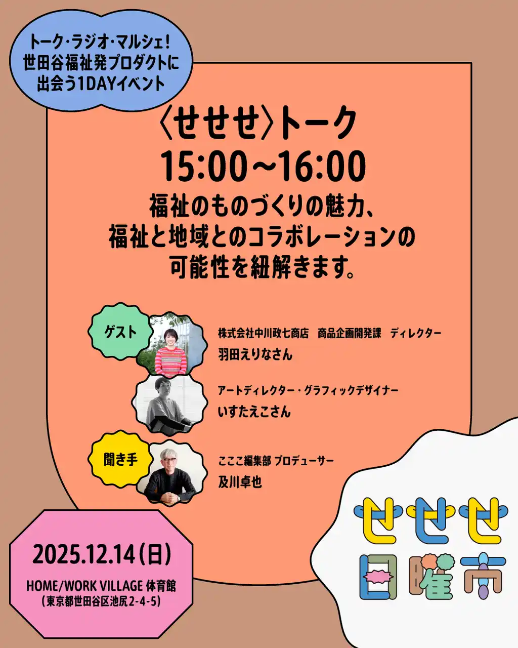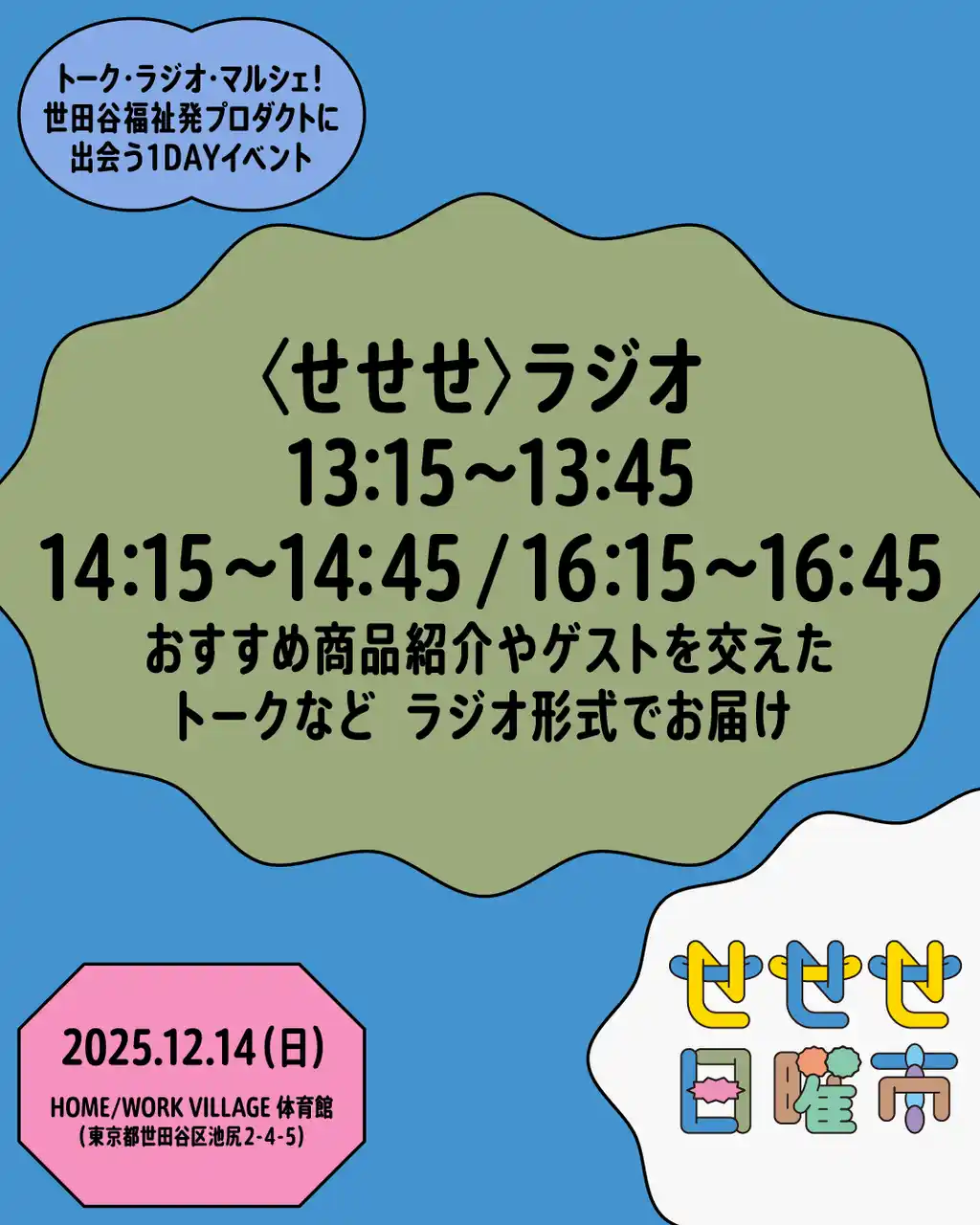 株式会社マガジンハウス(以下マガジンハウス、本社:東京都中央区、代表取締役社長:鉄尾周一)は、2025年12月14日に開催される「せせせ日曜市~トーク・ラジオ・マルシェ!世田谷福祉発プロダクトに出会う1DAYイベント~」(以下、「せせせ日曜市」)の企画・運営を担当しています。 |