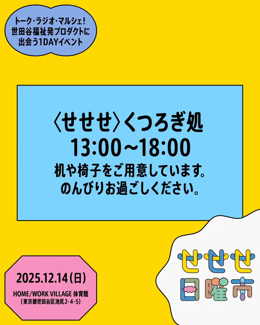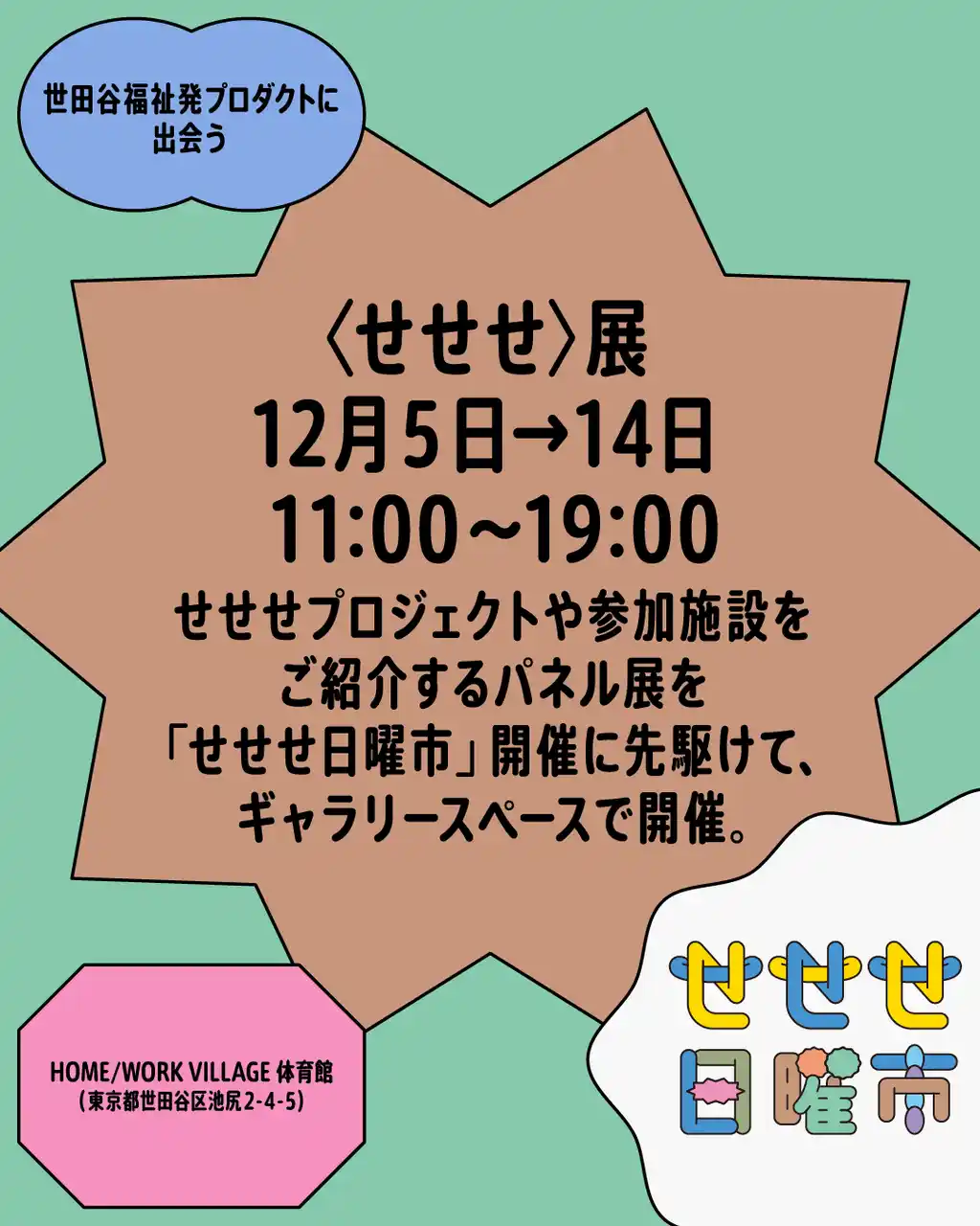また「せせせ日曜市」に先駆け、12月5日よりイベント会場であるHOME/WORK VILLAGE内にてプロジェクトをご紹介するパネル展「〈せせせ〉展」も開催します。合わせてお楽しみください。 |