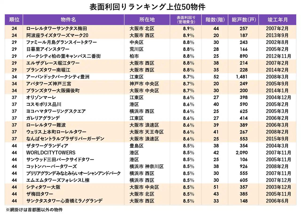 | 最も表面利回りが高かったのは、江東区の「豊洲シエルタワー」で表面利回り11.5%でした。ランキング上位50物件(同率のため実際は52物件)の中で表面利回りが10%を超えたのは6物件、9%台が17物件、8%台が29物件あり、上位の物件は総じて高い利回りになりました。 | |||