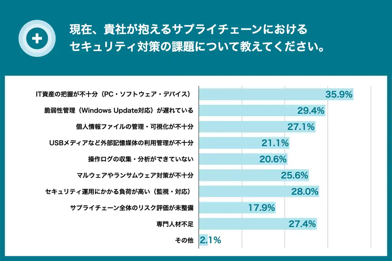「現在、貴社が抱えるサプライチェーンにおけるセキュリティ対策の課題について教えてください」(n=700)と質問したところ、最も多かったのは「IT資産の把握が不十分(PC・ソフトウェア・デバイス)」で35.9%、次いで「脆弱性管理(Windows Update対応)が遅れている」が29.4%、「セキュリティ運用にかかる負荷が高い」が28%、「専門人材不足」が27.4%という結果でした。 |