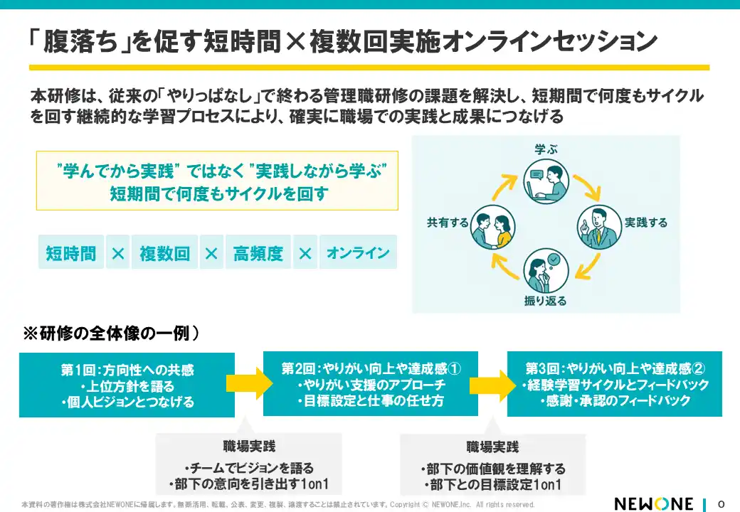 こうした背景のもと、NEWONEでは管理職が抱える、研修で学習したことを日常業務に活かしきれずにいる「やりっぱなし」課題を根本から見直し、学びを現場でより早く定着させるため、“短時間かつ高頻度で実践しながら学ぶ”研修アプローチへと進化させました。これにより、研修で学んだ内容を日常業務に落とし込み、行動と成果に早期につなげることを目指しています。 |