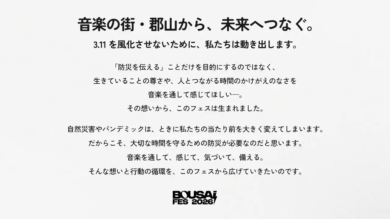 Yappe株式会社(本社:福島県郡山市、代表取締役:隂山弘暉)は、音楽を通じて防災をもっと身近に感じてもらうことを目的とした音楽フェス「BOUSAI FES 2026」を、2026年3月7日(土) 郡山 HIPSHOT JAPANにて開催いたします。 |