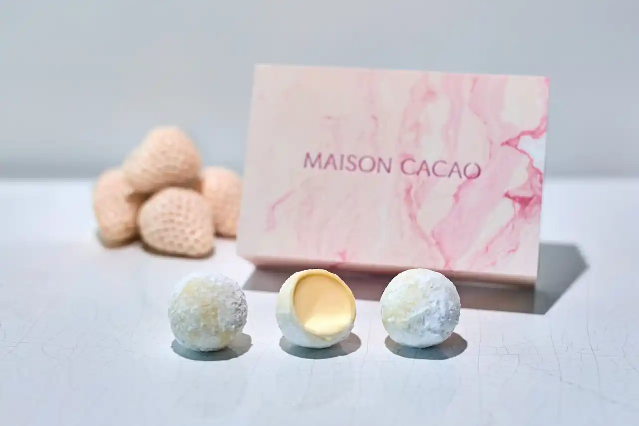 真っ白な一粒には、旅するメゾンで出会った“幻の白いちご”を贅沢に、白いちごならではの優雅な香りと深い甘みをそのまま閉じ込めました。ベースとなるのは、香り高いコロンビアンカカオのナチュラルカカオバターのみでつくり上げた、華やかで口溶けなめらかなホワイトチョコレート。白い果実の気品ある甘さが、余韻にふわりと広がります。 |