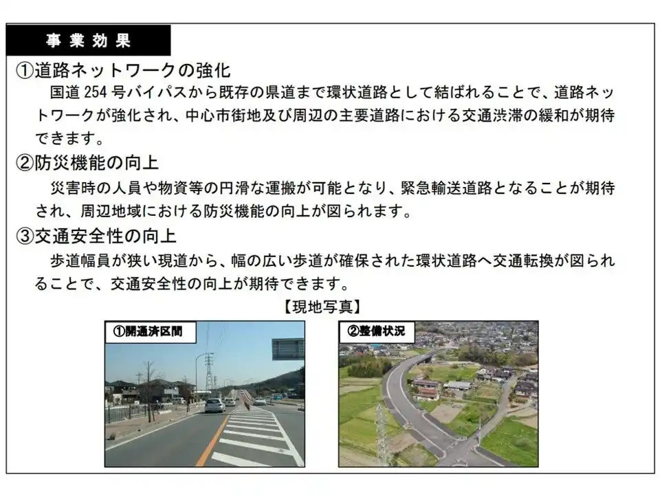| 事業効果としましては、道路ネットワークが強化され、交通渋滞の緩和や防災機能の向上が図られるとともに、交通安全性の向上が期待できます。また、開通に先立ち、同日午前10時から開通記念式典を行います。 | |||||||||||||||
