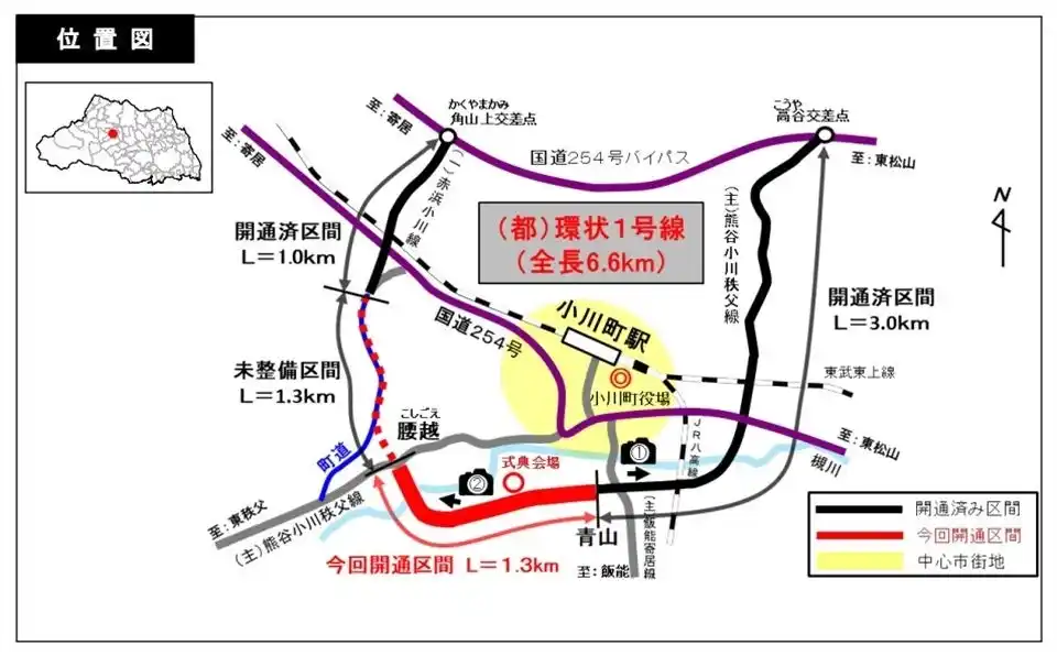 | 都市計画道路環状1号線は、国道254号バイパスと一体となって、東武東上線小川町駅を中心とした、小川町の中心市街地を環状に迂回する延長約6.6kmの都市計画道路です。 | |||||||||||||||